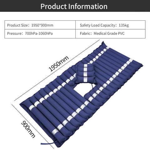 The DingLi medical air mattress anti-decubitus DL05 (Toilet hole style) is the perfect solution for patients who require lower extremity care while bedridden. The air mattress operates via alternating pressure to alleviate pressure sores and promote circulation. The toilet hole style adds extra convenience for patients with limited mobility. With its powerful and durable motor, the mattress can accommodate a weight capacity of 135kg. The anti-slip bottom keeps the mattress in place, while the medical grade PVC material is easy to clean and hygienic. The DingLi air mattress provides a comfortable and safe solution for patients with decubitus ulcers or those who require prolonged bed rest.