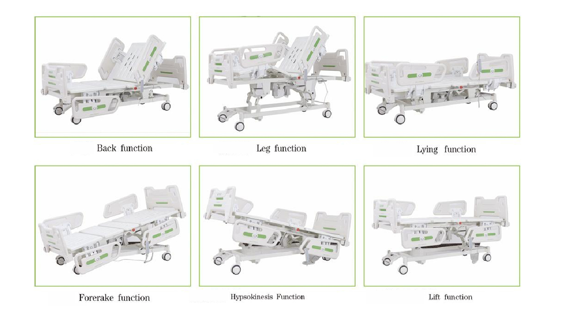 Wholebedsize: 2120*980*400-700mmMaterial: steel powder coatedLeft-leaning/Right-leaning section: 0-45°Forerake/hypokinesis section: 0-12°Back section: 0-75°Legsection: 0-45°