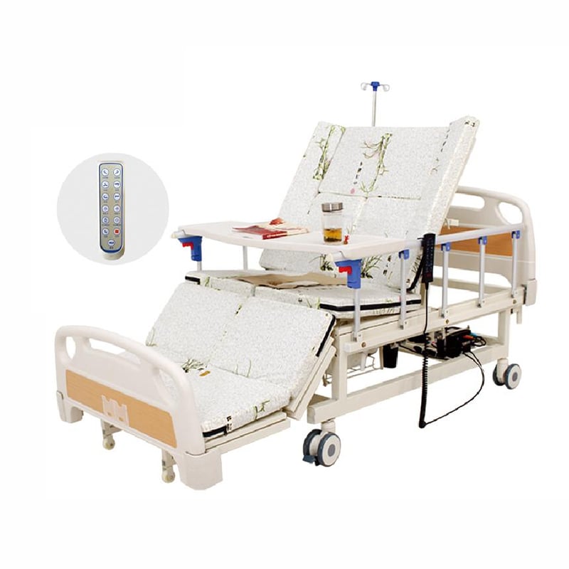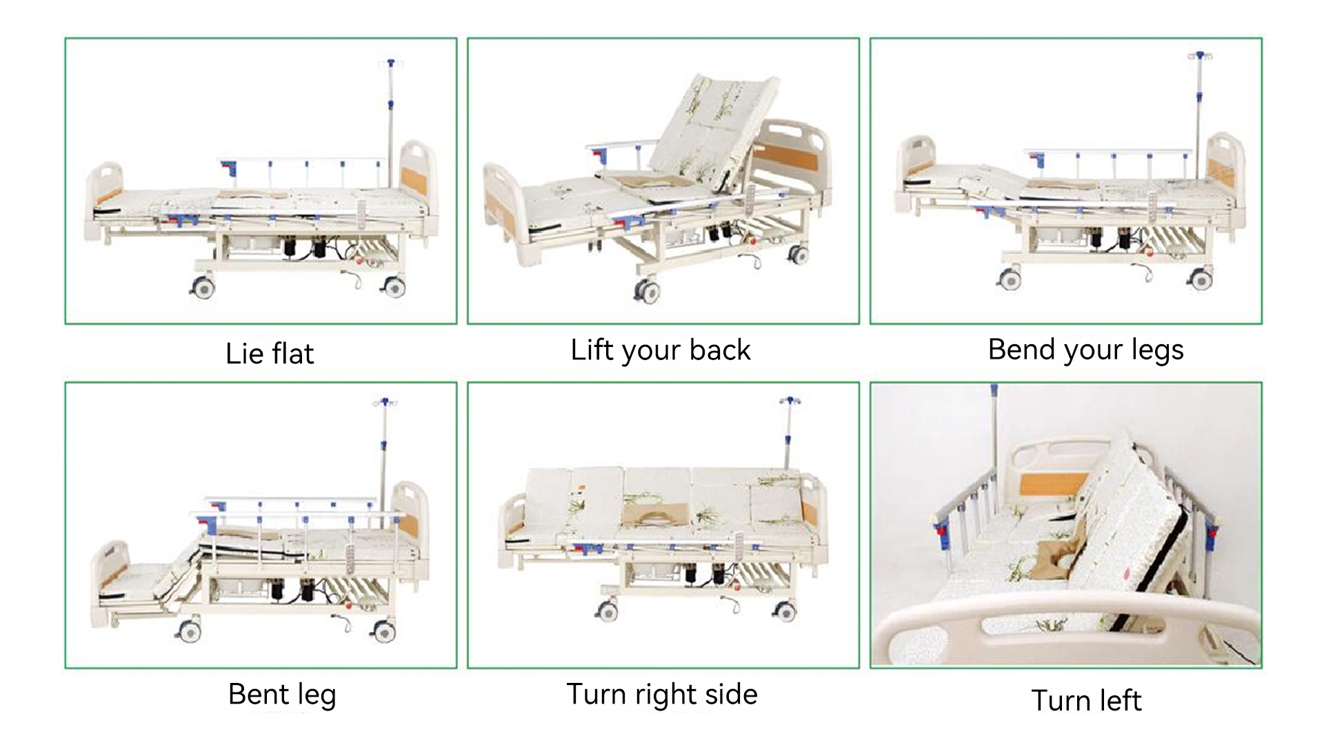Electric rollover nursing functions include back section, rollover function, leg section, wheelchair function, transfusion function, washing hair function, toilet function, dining function, and moving function. It makes care more relaxed and comfortable, The product is suitable for hospitals, the older people, and other patients with lots of self-care.